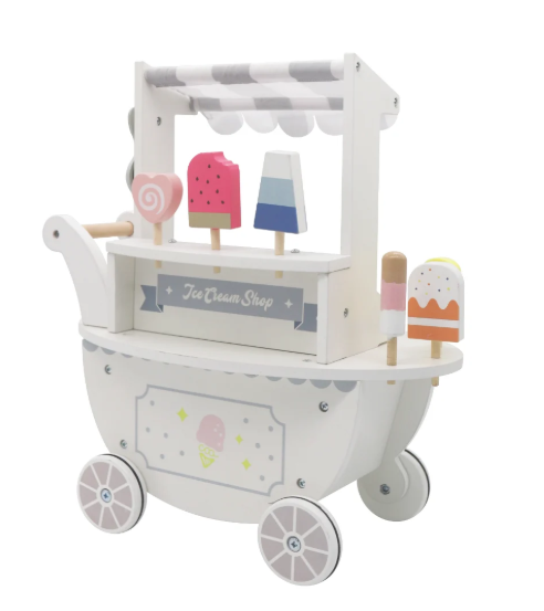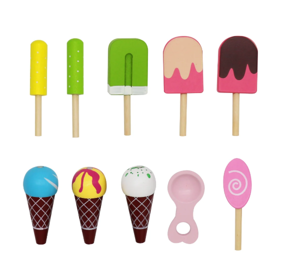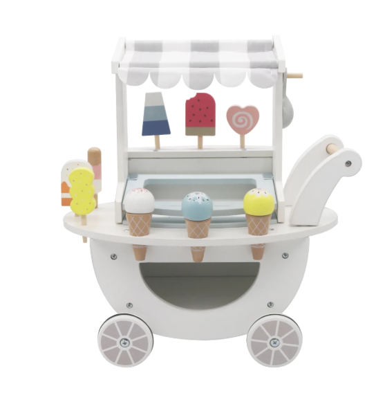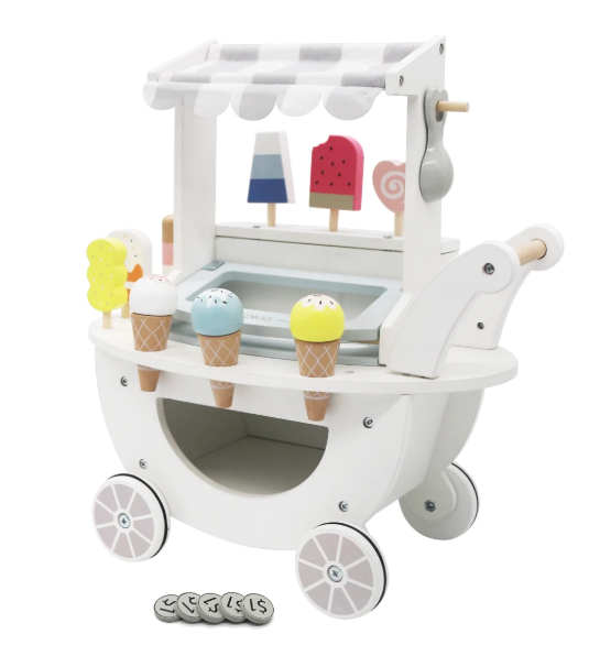 גלידרייה ניידת מעץ איכותי לילדים, כוללת מגוון גלידות ואביזרים. משחק יצירתי שמעשיר את הדמיון, מפתח מוטוריקה עדינה וגסה ומשפר תשומת לב לפרטים