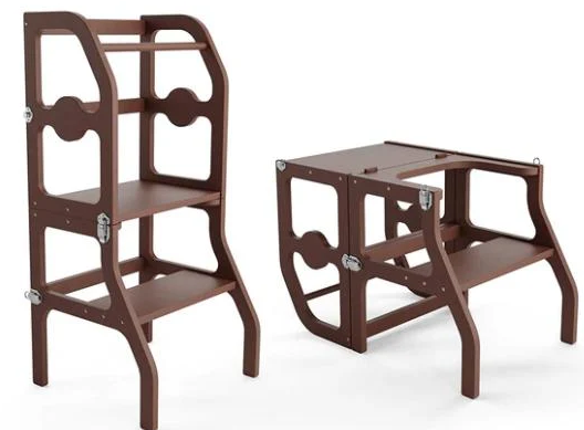 מגדל למידה רב שימושי מתקפל והופך משולחן לכיסא באמצעות מנגנון נעילה בטיחותי לילדים.