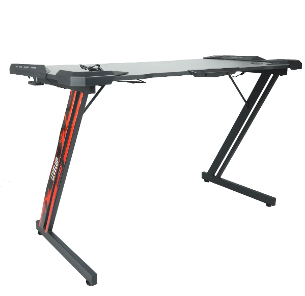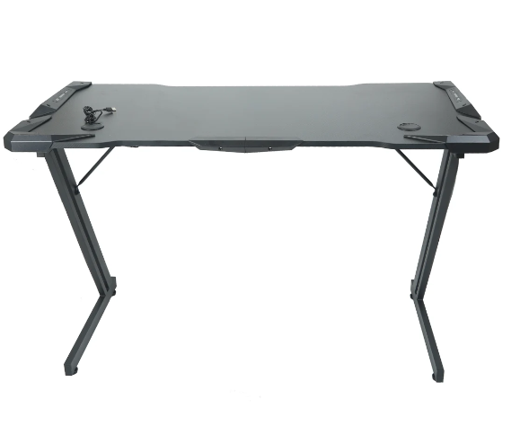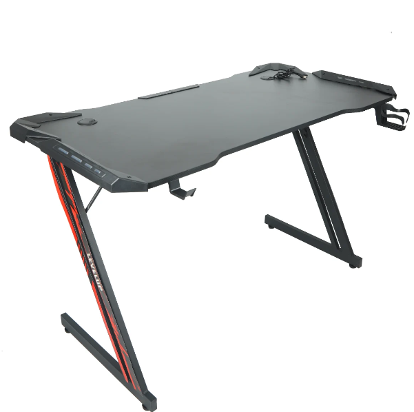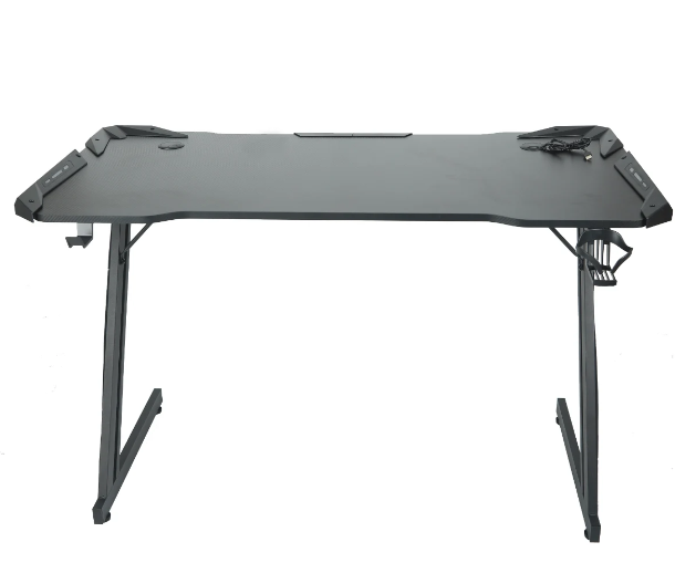 שולחן מרווח ונוח לישיבה ארוכה מול המחשב, כולל משטח בעיצוב סיבי פחמן, תאורת LED מרשימה, מתלה ייעודי לאוזניות ומחזיק כוסות נשלף.