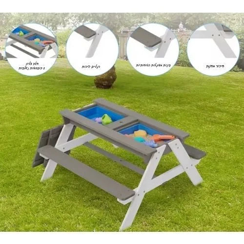 שם המוצר: שולחן פיקניק מעץ לילדים עם שימשייה ותאי פעילות דגם פליי