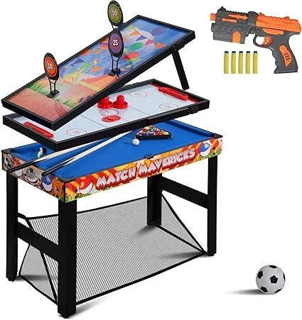 ניתן לבחור ולהחליף משחק בקלות על ידי החלפת המשטחים המתלבשים על גבי השולחן למשחק כדורגל, סנוקר, הוקי או משחק יריות.