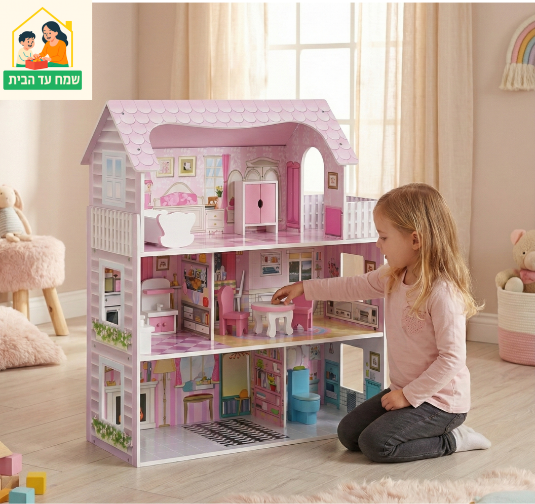 W06A139 - בית בובות טלי לילדים שלוש קומות, בצבעים בהירים כולל ריהוט לבית, צעצועץ